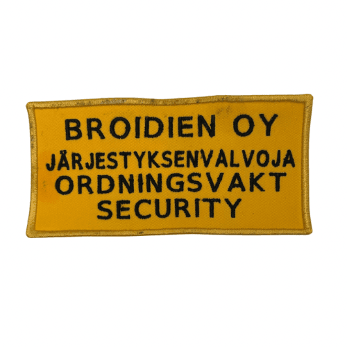 Brodeerattu erittäin laadukas rintakyltti järjestyksenvalvojalle. Saatavilla sekä velcropohjalla että silitettävänä patchina. Laadukas brodeeraus pitää merkin ehjänä ja siistinä.