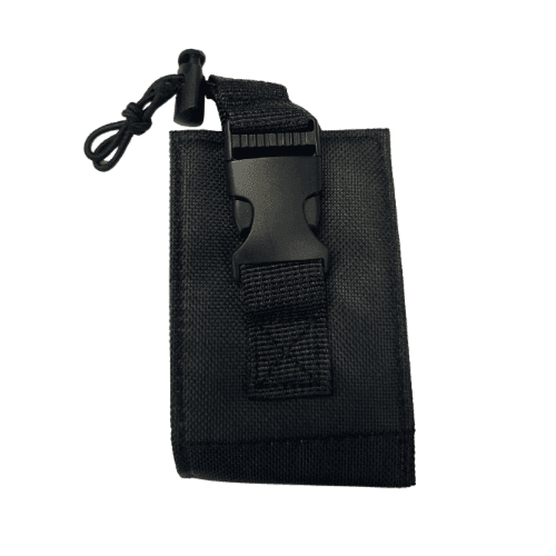 Klipsillä varustettu edullinen musta radiopuhelintasku. Kiinnitettävissä vyölle tai olkapolettiin kahdella nepparilla varustetulla hihnalla.